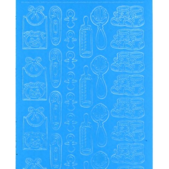 AUTOCOLANTES AZUIS – 6 BABETES, 7 ALFINETES DE DAMA, 14 CHUPETAS, 6 BIBERÕES, 6 ROCAS, 13 PARES DE BOTINHAS – MEDIDAS APROXIMADAS 3 CM
