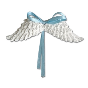 Asas de Anjo em gesso perfumado com fragrância de Flores Frescas, embalado em saquinho de organza, além disso leva uma fita de cetim, que serve para pendurar em qualquer lugar da casa que deseje perfumar.