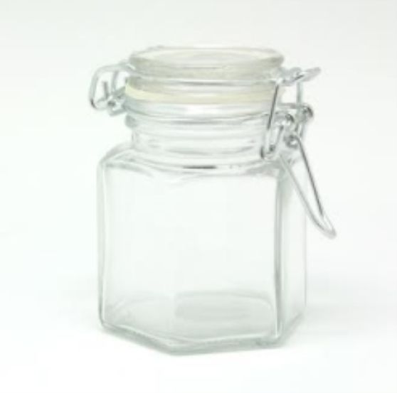 Boião de vidro exagonal com tampa de pressão – borracha vedante branca. Pote com tampa hermética – Medidas 6×8 cm – 110ml – ideal para doces, porta condimentos, prendinhas, trabalhos com biscuit – 1 UNIDADE