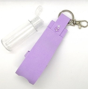 Bolsinha decorada, com frasco pet tampa flip-top vazio e fecho mosquetão com argola, para pendurar na carteira. Portanto vai estar sempre pronto para desinfetares as tuas mãos com álcool gel, ou álcool.