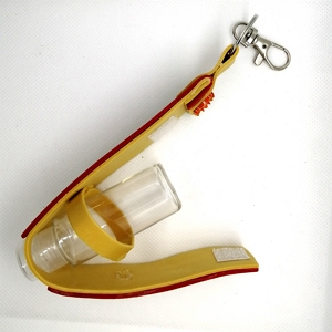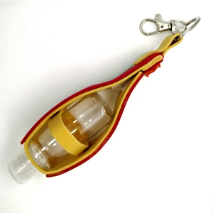 Bolsinha decorada, com frasco vazio e fecho mosquetão com argola, muito elegante para pendurar na carteira. Assim vai estar sempre pronto para desinfetares as tuas mãos com álcool gel, ou álcool.