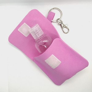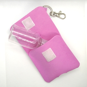 Bolsinhas decoradas, com frasco vazio e fecho mosquetão com argola, para pendurar na mochila para levares para a escola. Assim vai estar sempre pronto para desinfetares as tuas mãos com álcool gel, ou alcool.