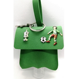 Bolsinhas decoradas, com frasco vazio e fecho mosquetão com argola, para pendurar na mochila para levares para a escola. Assim vai estar sempre pronto para desinfetares as tuas mãos com álcool gel, ou alcool.