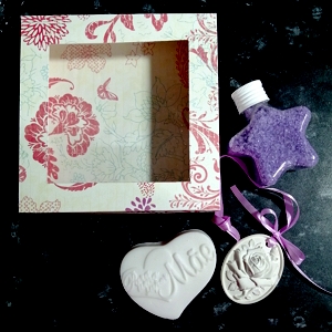 A caixa contem 1 frasco estrela de sais de banho, 1 sabonete Coração Super Mãe,1 gesso perfumado. Aroma Alfazema