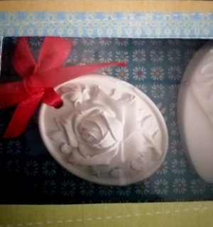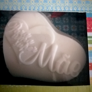A caixa contem 1 sabonete coração “para uma super Mãe”, 1 gesso perfumado. Aroma Talco Rosa