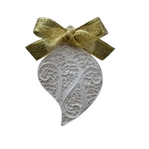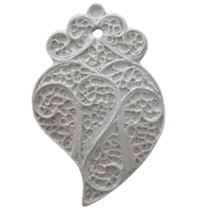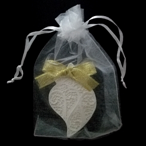 Coração de Viana grande em gesso perfumado. 8x5x1cm, com fragrância de Flores Frescas, ou outro embalado em saquinho de organza, além disso leva uma fita e laço, que serve para pendurar no guarda fatos e em qualquer lugar da casa que deseje perfumar.