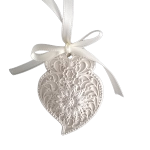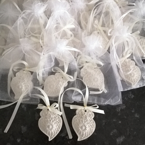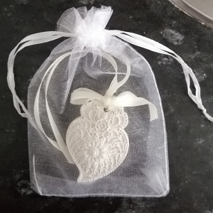 Coração de Viana médio com flor em gesso perfumado 5,5x4x1cm, com fragrância de Flores Frescas, ou outro embalado em saquinho de organza, além disso leva uma fita de cetim, que serve para pendurar no guarda fatos e em qualquer lugar da casa que deseje perfumar.