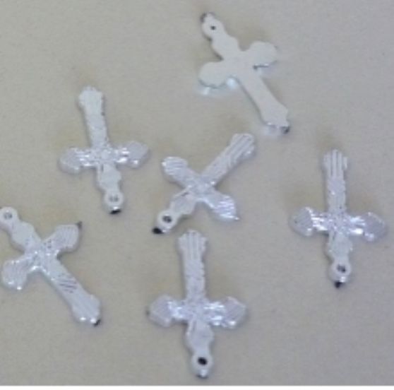 Cruz prateada 2,5×1,5cm. Utiliza-se como pendente, cruz das dezenas, terços, aplicações batizado, casamento, comunhão. Scrapbooking. Pac 10 unidades