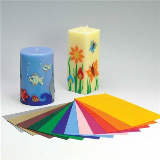 Folhas de cera colorida para decoração de velas . Cores: amarelo sol, laranja, vermelho, violeta, rosa, azul claro, azul ultramarino, verde claro, verde pinho, bronze, ouro, prata. Pack de 12 folhas. 200 x 100 x 0,5 mm.