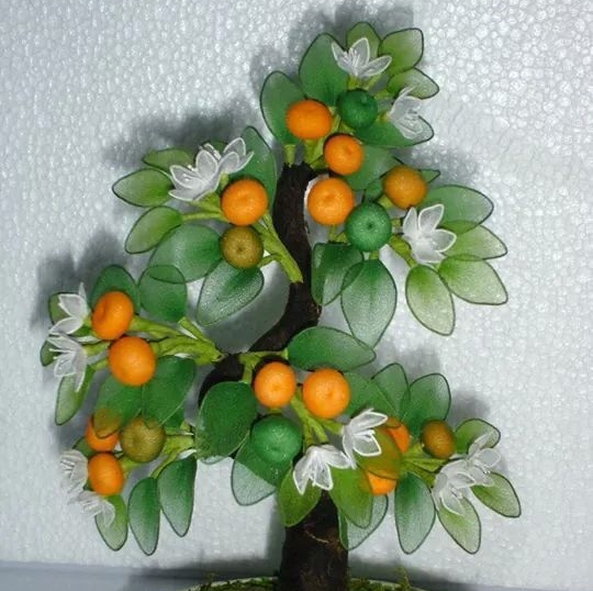 Arranjo com meia de seda laranja, meia verde folha, meia de seda branca, arame branco, arame verde.