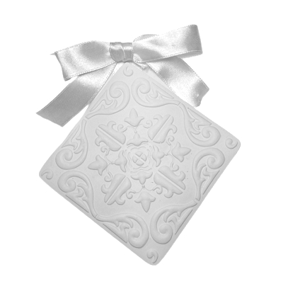 Quadrado em formato de azulejo em gesso aromatizado com as medidas 7.5×7.5x1cm com laço, embalado em saquinho de organza.
