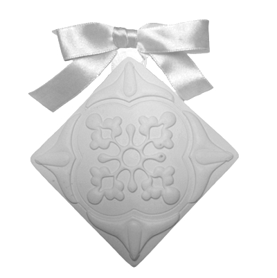 Quadrado em formato de azulejo em gesso aromatizado com as medidas 7.5×7.5x1cm com laço, embalado em saquinho de organza.