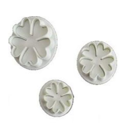 CONJUNTO DE 3 CORTADORES TREVO DE 5 FOLHAS – CORTADORES COM EJETOR – EJECTOR PARA MASSAS – Produzido em material de alta qualidade, estes ejetores são próprios para o uso na culinária e confeitaria. Perfeito para produzir belas decorações com vários tipos de massa. Excelente também para trabalhos em artesanato com biscuit