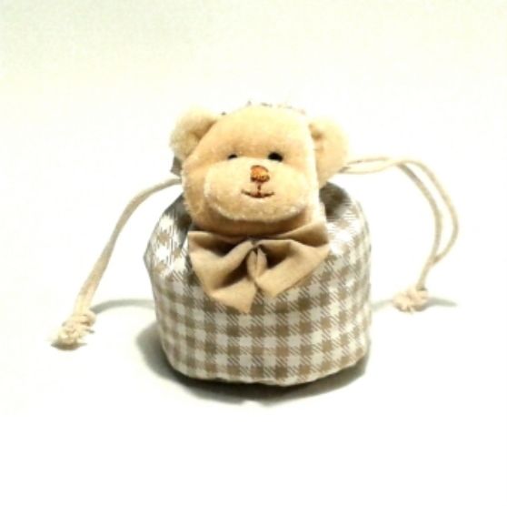 Ursinho com saquinho castanho com quadradinhos brancos e cordões para pendurar.