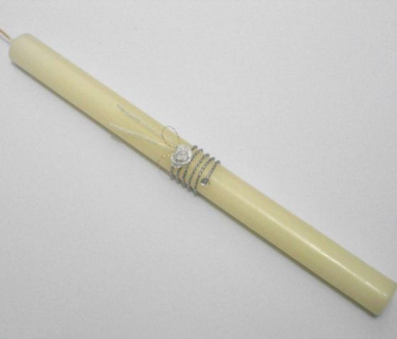 VELA DE BAPTIZADO – Vela redonda com 31×2 cm decorada com florinhas brancas, filet prateado e brilhante no remate. Vela não envernizada. Fornecida com caixa. VELAS DE BAPTISMO. VELAS DE BATIZADO.