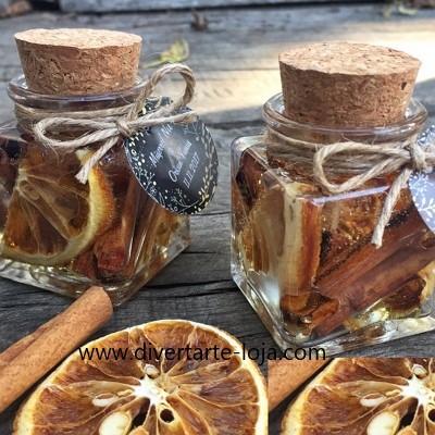 Frasco quadrado 40 ml, rolha de cortiça, com Velinhas Gel com Laranja e Canela. 10 unidades